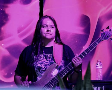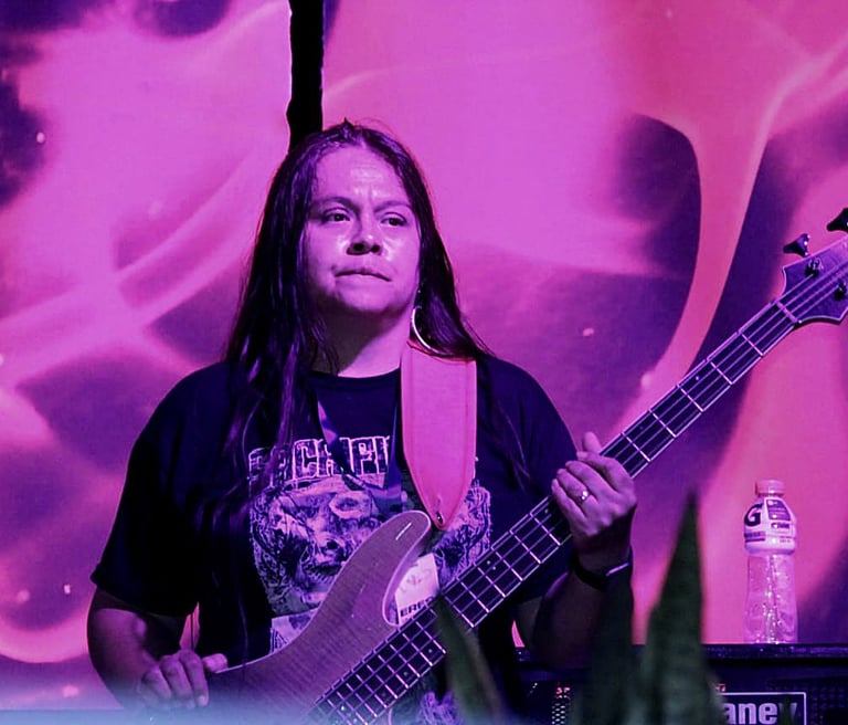 Con raíces en el death metal técnico, Rocío fusiona pasión y precisión en cada bajo que toca.